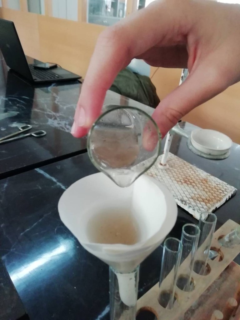 Սարքավորումներ` Լաբորատոր կալան, սպիրտայրոց, բաժակ, ձագար, ֆիլտրի թուղթ,ապակե ձող, կոլբ, ճենապակյա թաս